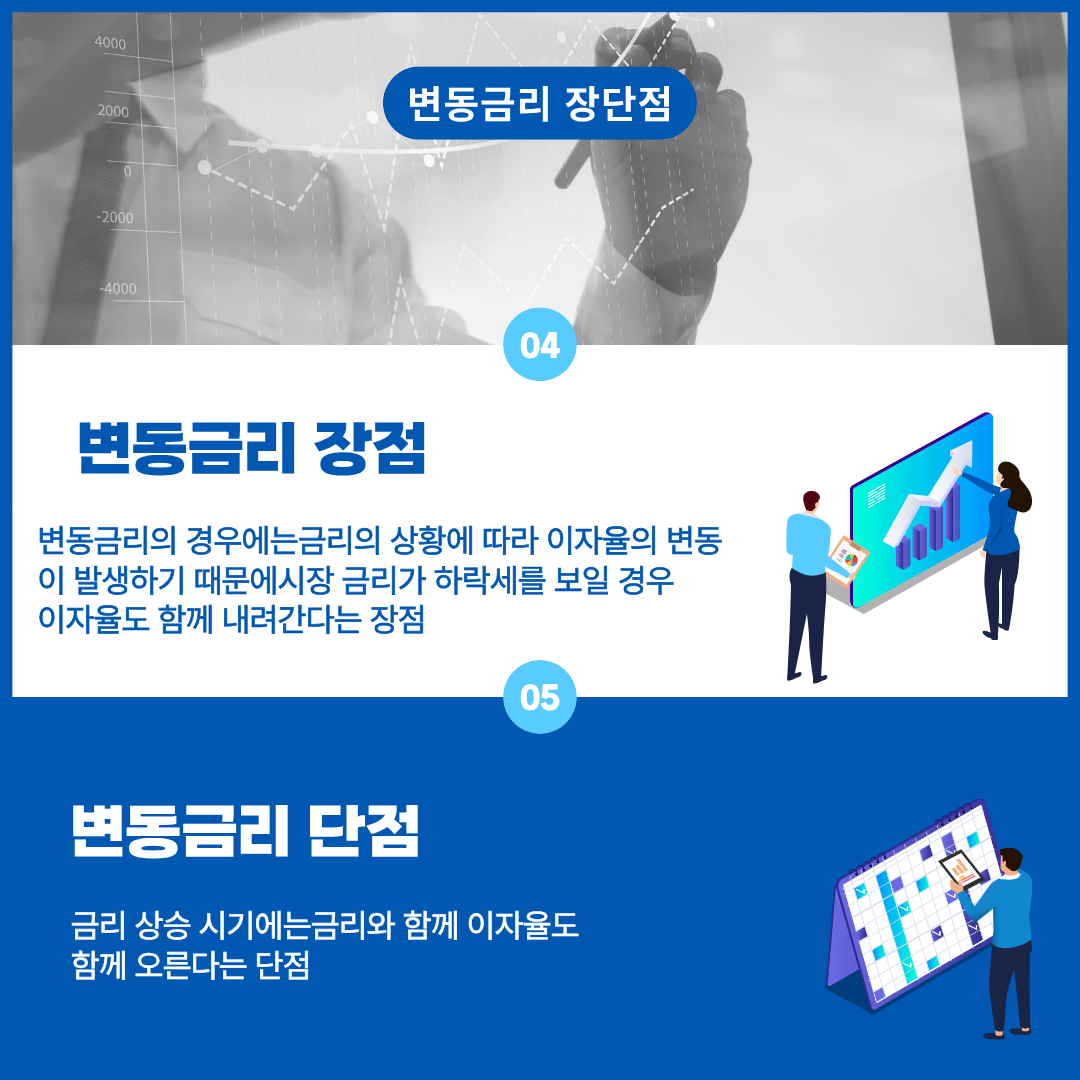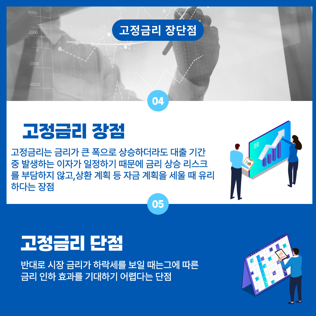 | 단점 | 금리 하락 시 이자 부담 고정 | 금리 상승 시 이자 부담 증가 | 전환 후 금리 상승 시 위험 |