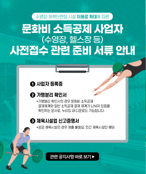 - 대상 시설: 체육시설의 설치·이용에 관한 법률 제10조에 따른 체육시설업에 해당하는 곳이어야 합니다. 즉, 시·군·구청에 정식으로 신고된 시설이어야 해요.