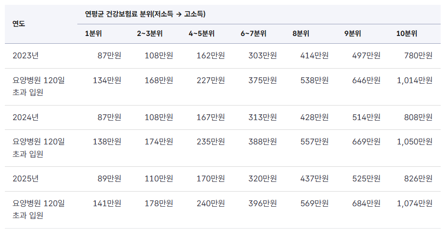 2025년 본인부담상한액은 소득 수준에 따라 최저 89만 원부터 최고 826만 원까지 10분위로 나뉘어 있어요. 요양병원에 120일 넘게 입원한 경우는 기준이 조금 다르니, 자세한 금액은 아래 표를 참고해주세요.