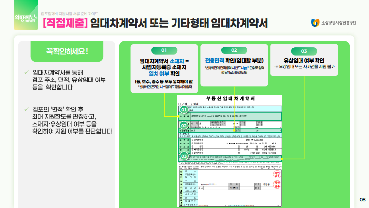 필수 서류: 사업자등록증명원(폐업자는 폐업사실증명원), 임대차계약서 사본, 통장 사본 등