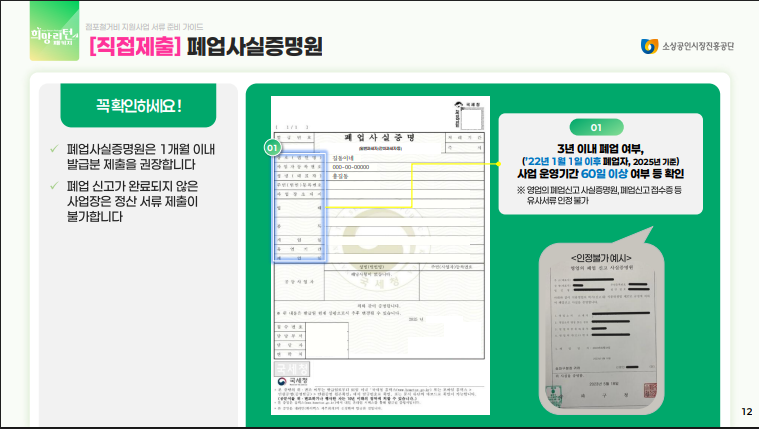 신청 시 어떤 서류를 준비해야 할지 미리 확인하는 게 좋아요. 폐업 여부에 따라 조금씩 다르니 꼭 체크해 주세요.