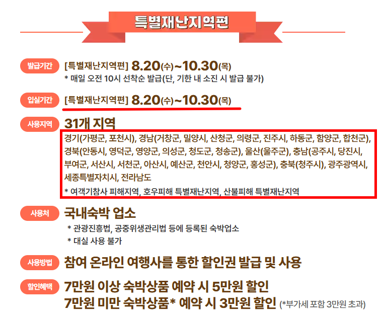 가을편과 특별재난지역편 쿠폰은 중복 사용이 불가능합니다. 쿠폰 발급 시 내가 가려는 지역이 특별재난지역인지 꼭 확인해야 해요.