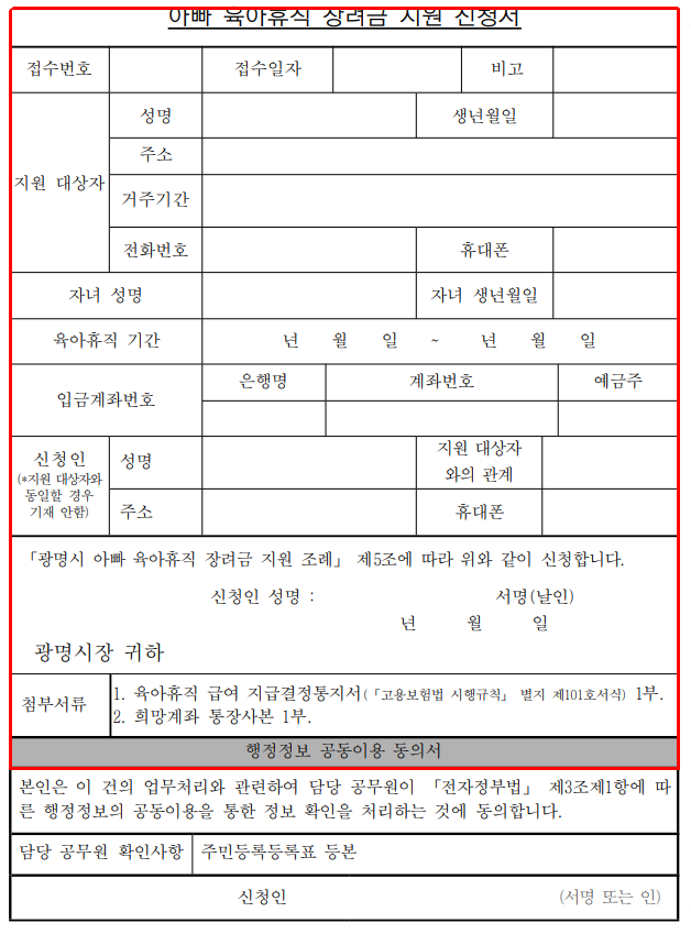 아빠육아휴직 선정 기준은 광명시에 1년 이상 거주 조건 있음