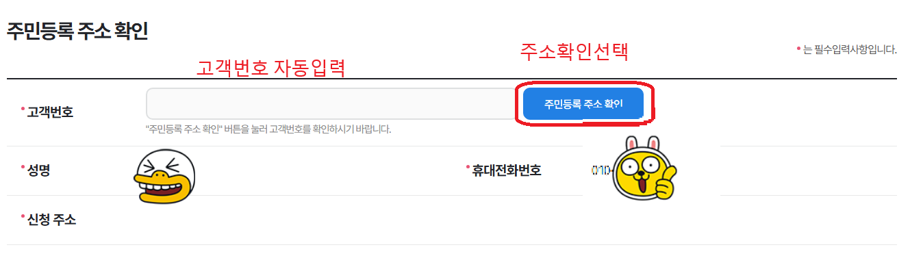 이제 마지막 단계로 고객번호를 입력 하면 되는데, 수동으로 입력하는게 아니라, 주민등록주소확인버튼을