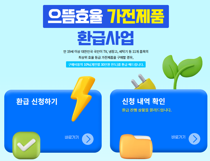 만 19세 이상 대한민국 국민이라면 누구나 신청할 수 있습니다. 소득이나 재산 기준 없이 전 국민이 대상이므로, 새로 가전을 구매할 계획이 있으시다면 꼭 확인해 보세요.