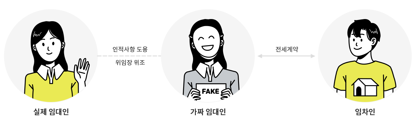 임대인이 아닌 사람이 임대인인 척 명의를 도용하는 경우가 심심치 않게 발생하는데요. ‘가짜 임대인’이 건물을 임대하면서 알아낸 ‘실제 임대인’의 인적사항을 이용하여 자신이 건물주인 척 거짓된 전세계약을 한 후 세입자의 보증금을 가로채는 방식입니다. 혹은 임대인의 위임장 또는 증명서류를 위조해 대리인 행세를 하면서 세입자의 보증금을 가로채기도 합니다.