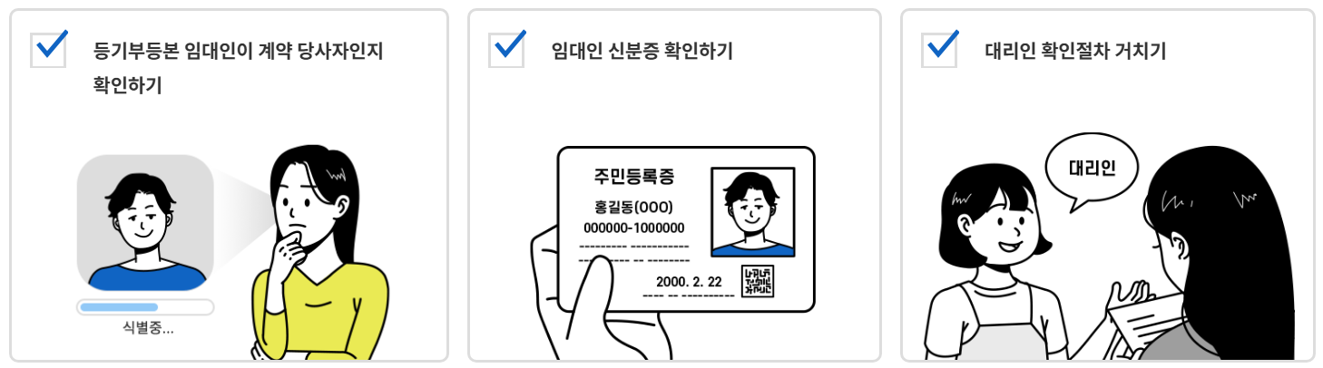 계약 전에는 반드시 임대인의 신분증과 등기부등본상 소유주가 일치하는지 확인해야 합니다. 만약 대리인과 계약한다면 위임장과 인감증명서를 꼼꼼히 확인하고, 임대인 본인과 직접 통화하여 위임 사실을 확인하는 것이 좋습니다.