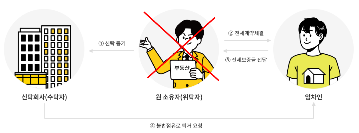 주택 소유권이 신탁회사에 있음에도 임대인이 본인과 계약을 맺는 유형입니다. 등기부등본 '갑구'에 신탁회사 이름이 있다면 반드시 신탁원부를 확인하고 신탁회사의 동의를 받아야 합니다.