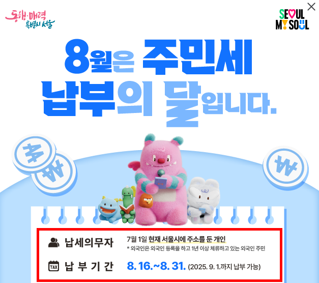 - 납부 기간: 매년 8월 1일 ~ 8월 31일