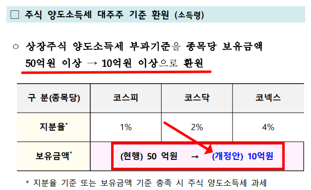 1.2025년 세제개편으로 양도소득세 대상인 대주주 기준이 기존 50억원 이상에서 10억원 이상으로 하향