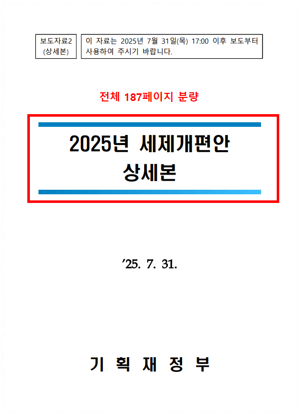 세제개편안의 배경을 설명한다는게 사설이 너무 길어졌네요. ^^ 자! 이제 본격적으로 세재개편안에 대해서 얘기해보겠습니다. 기획재정부에서 발표한 세제개편안은 총 187페이지 분량 입니다. 이 개편안 내용 중에서 우리가 관심가져야할 부분에 대해서 요약해서 포스팅 하겠습니다.