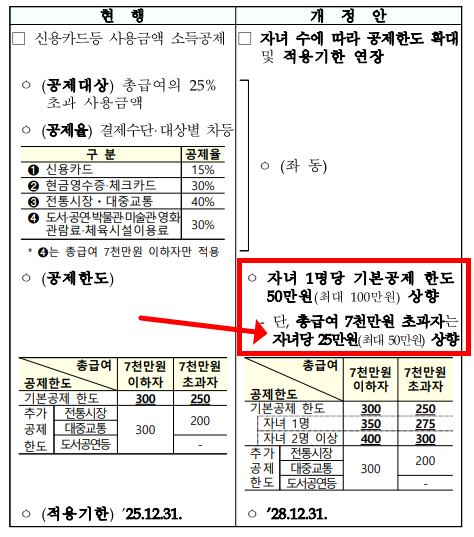 자녀 수에 따라 신용카드 등 소득공제 한도 금액이 확대 됩니다. 기존에는 총급여 7천만원 이하인 경우 기본공제 한도금액이 300만원 이였는데, 26.1.1일 후 개시하는 과세기간 분 부터는 자녀1명 350만원 자녀 2명이상은 400만원으로 확대 지원 됩니다.