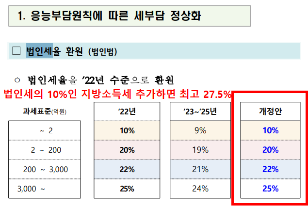 2. 법인세율이 전 구간에서 1%씩 인상돼, 최고세율이 24%에서 25%로 상향!