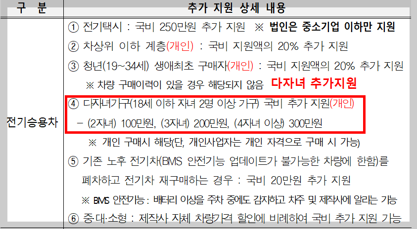 요즘 다자녀 혜택이 너무 좋은데요. 3자녀만 주는 혜택을 이제 2자녀 에게도 지급 가능하니, 18세 이하 자녀가 있는 분들은 기존 전기차보조금에서 추가 100만원 지원 받을수 있습니다.