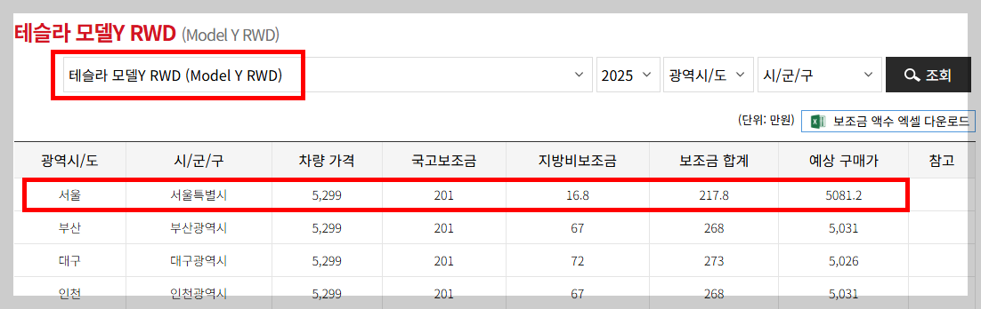 예를들어 지금 가장 인기가 많은 테슬라모델Y RWD모델 같은 경우도 통합누리집에서 지역별로 보조금 금액을 올려놓았으니 거주지 주소 기준으로 확인해 보시면 됩니다.